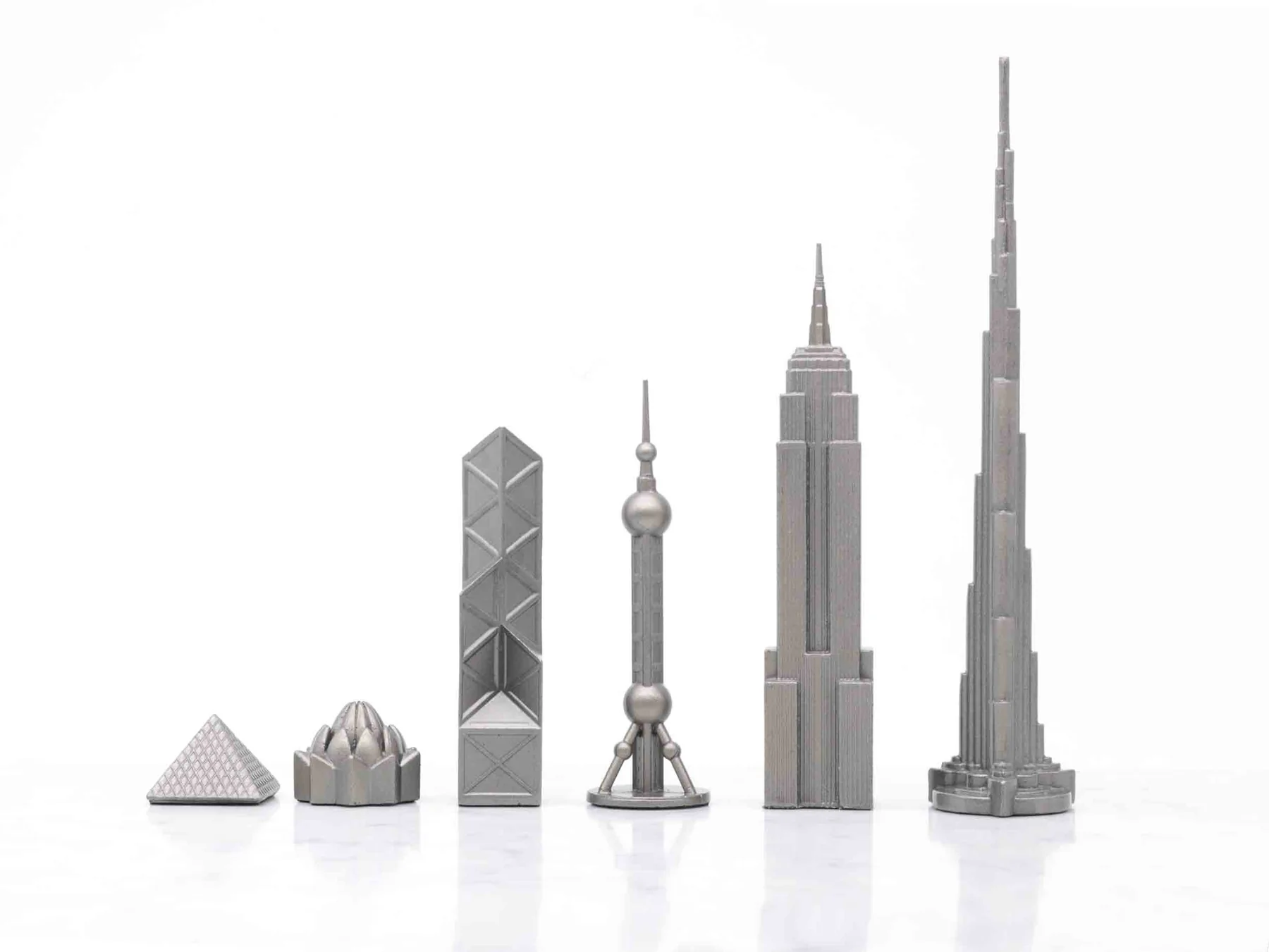 - Silver Side: King – Burj Khalifa, Queen – Empire State Building, Bishop – Oriental Pearl TV Tower, Knight – Bank of China Tower, Rook – Lotus Temple, Pawn – Louvre
