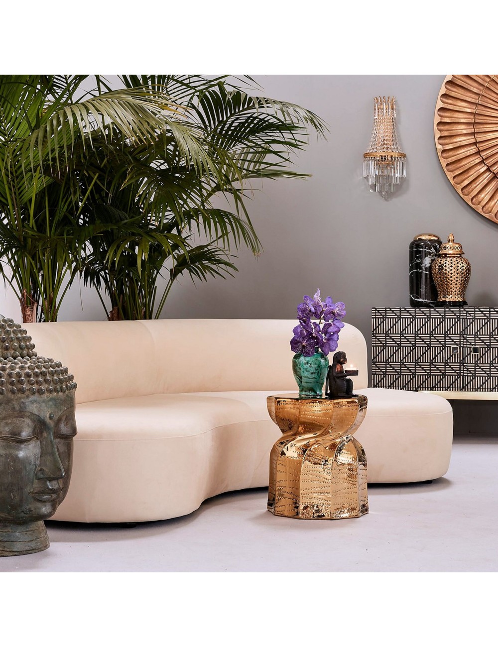 Contemporary piece made in ceramic, designed in twisted hourglass shape featuring detailed hammered pattern. The modern stool in shiny gold finish, that instantly adds a touch of glamour and exclusivity to the environment in which it is inserted. The smooth surface reflects light and the high quality of workmanship making it not only a practical piece of furniture, but also a unique interior decoration.